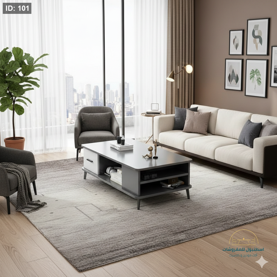طاولة وسط أنيقة مصنوعة من الخشب المتين بلون رمادي جذاب، تتميز بتصميم ذكي يحتوي على درج جانبي وأرفف مفتوحة لتنظيم الكتب والإكسسوارات، مع أرجل مرتفعة تضفي لمسة من الأناقة وتسهل عملية التنظيف.