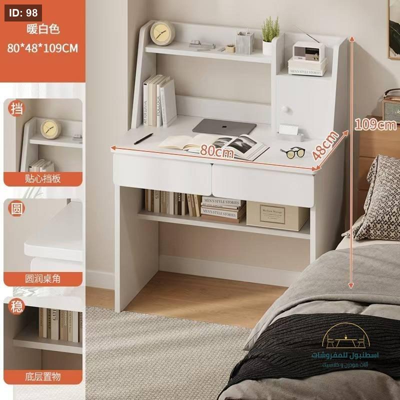 مكتب أنيق وعملي مصنوع من الخشب باللون الأبيض الدافئ، صُمم خصيصاً ليناسب المساحات المحدودة مع توفير أقصى درجات التنظيم. يتميز بوجود أرفف علوية مدمجة لتنسيق الكتب والديكور، وأدراج أمامية واسعة للأدوات المكتبية، بالإضافة إلى رف سفلي إضافي يوفر مساحة تخزين ذكية تحت سطح العمل.